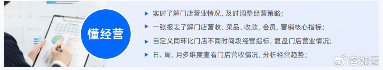 客如云的报表功能直接给答案:一张报表即可聚集门店营收、菜品、收款、会员、营销核心指标;同时,支持自定义经营维度,通过多时段同环比分析清晰呈现数据差异;结合日、周、月多维度查看门店营收情况,分析经营趋势,从而在风险初现时及时止损,于数据中捕捉增长商机,实现决策与经营实际的高效匹配。