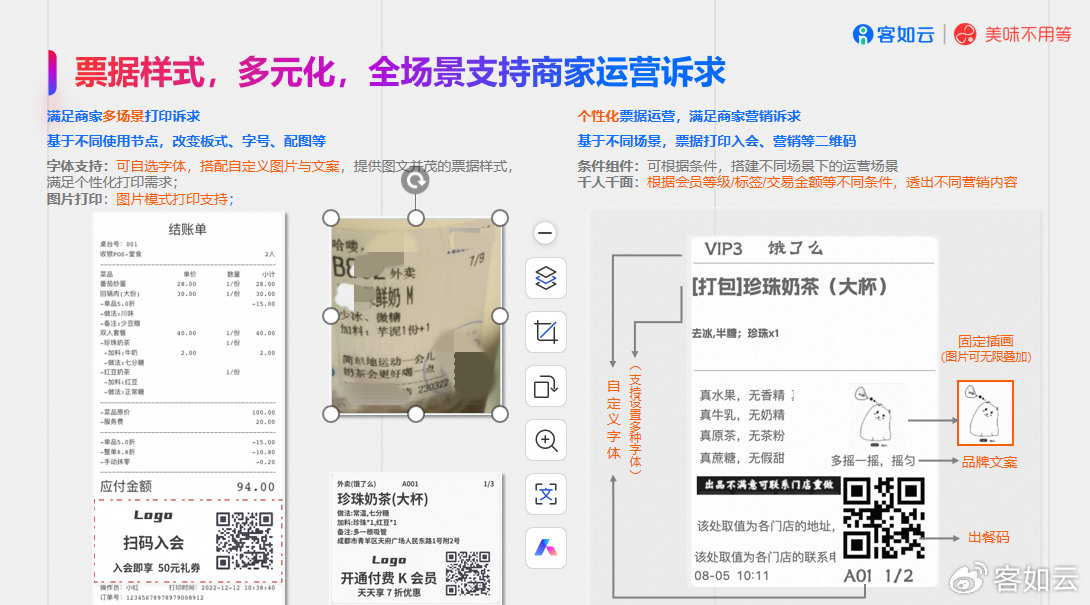 客如云的个性化票据和杯贴功能,把每一张结账单、每一杯奶茶都变成 “会说话的广告牌”:既能依据不同使用场景灵活调整版式、字号与配图,充分满足个性化打印诉求,又能根据会员等级、用户标签、交易金额等多维度条件智能匹配差异化营销内容,让每一张票据、每一枚杯贴都成为贴合用户需求的沟通载体。