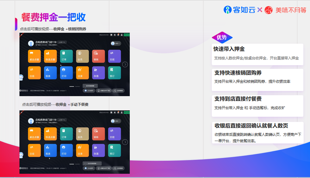 客如云行业纵深,提供的正餐解决方案能够有效减轻该业态下的服务压力,从而帮助提升服务品质。针对正餐的一些实际应用场景,不同的功能将应对逐一解决。