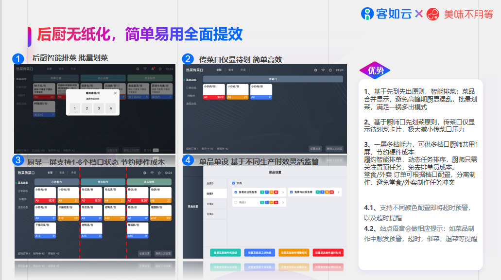 客如云正餐解决方案除了前厅提效,还包括后厨效率的协同。KDS智能厨显可以有效提升后厨的管理运营效率,最典型的就是缩短出餐时间,减少客诉情况发生。如下单后,订单信息可即时同步至后厨接单,清晰显示订单详情,包括菜品规格、备注要求等,无需人工传递单据,提升响应速度。此外,菜品沽清等信息实时同步,减少超售与漏单情况。更有超时预计语音预警,避免顾客长时间等待。